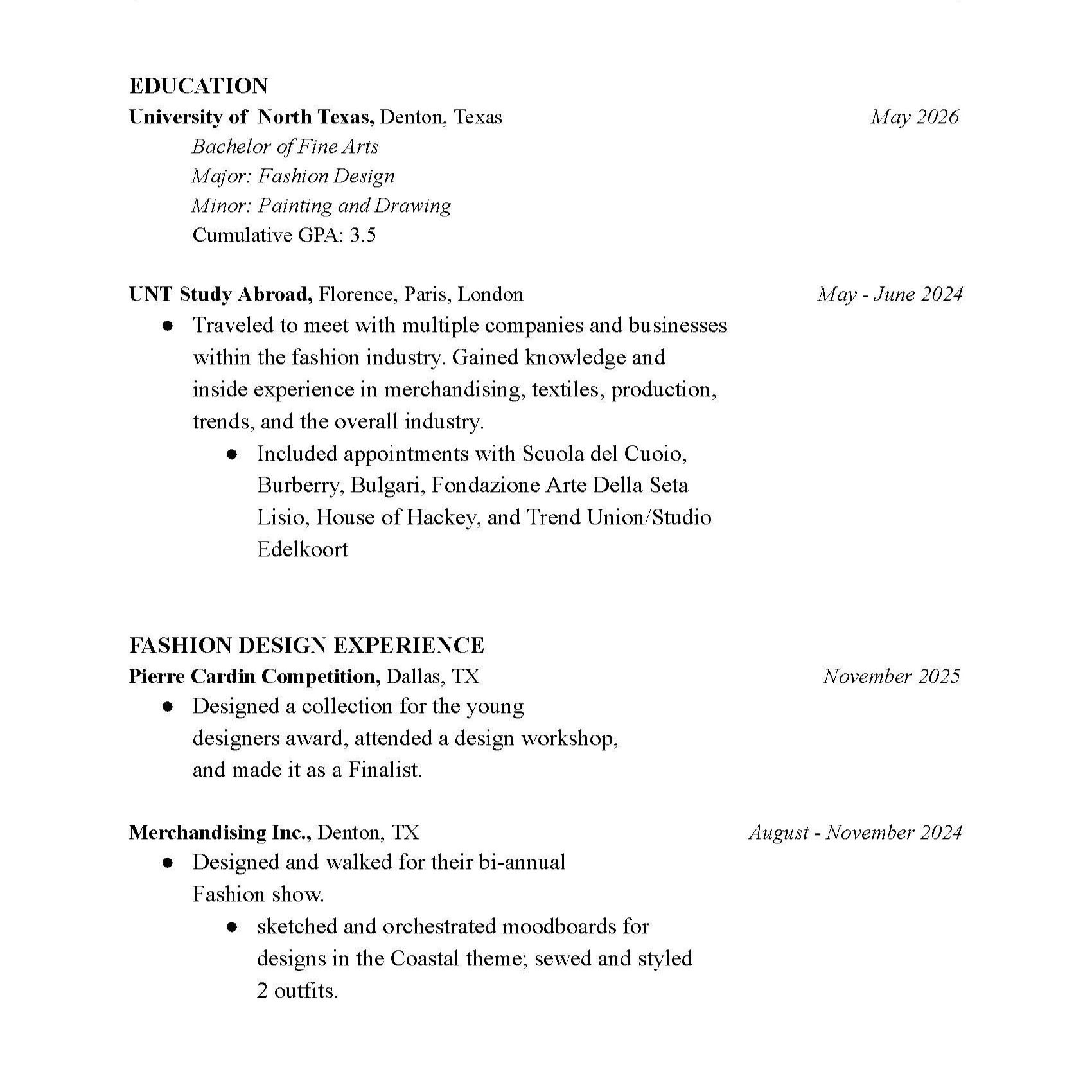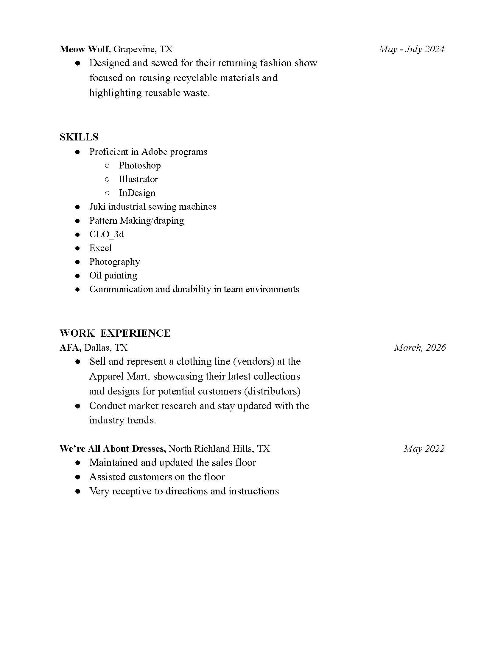 Learning from my mom, I started sewing from a young age. It grew into interests of style, fashion, costumes, and everything in between. Since then, I have studied at the University of North Texas, participated in various fashion shows, and exhibited. Currently working in the sales market and trend forecasting, I try to gain as much knowledge as possible in all parts of the industry. I want to continue to be a part of the influence fashion has in directing style, creating confidence to try new things, and fully encapsulating a story in the designs.